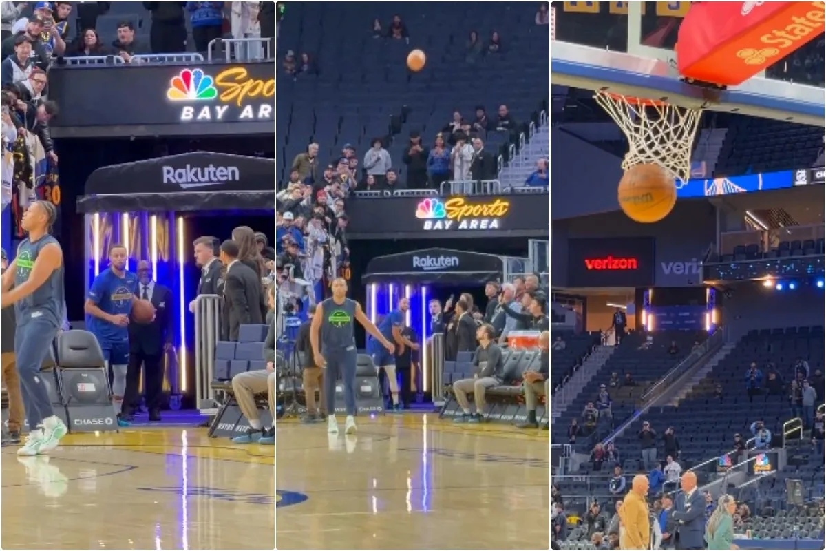 Ο απίθανος Κάρι δοκίμασε trick shot, στα οποία ειδικεύεται, στο ζέσταμα του αγώνα από το τούνελ και είδε την μπάλα να του κάνει το χατήρι. Απλά δεν γίνεται να μπήκε αυτό το σουτ, δεν γίνεται…