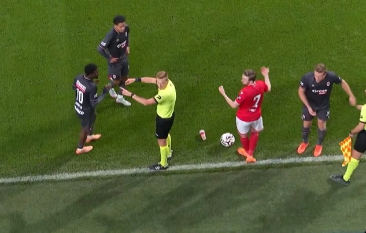 Ο Lothar D’Hondt είχε πάει κοντά στον βοηθό του για να απομακρύνει τους παίκτες των ομάδων που του διαμαρτύρονταν, όταν ένα μπουκάλι τον βρήκε στην πλάτη. Άμεσα εκείνος πήρε τους συνεγάτες του και πήγαν στα αποδυτήρια, διακόπτοντας τον αγώνα.