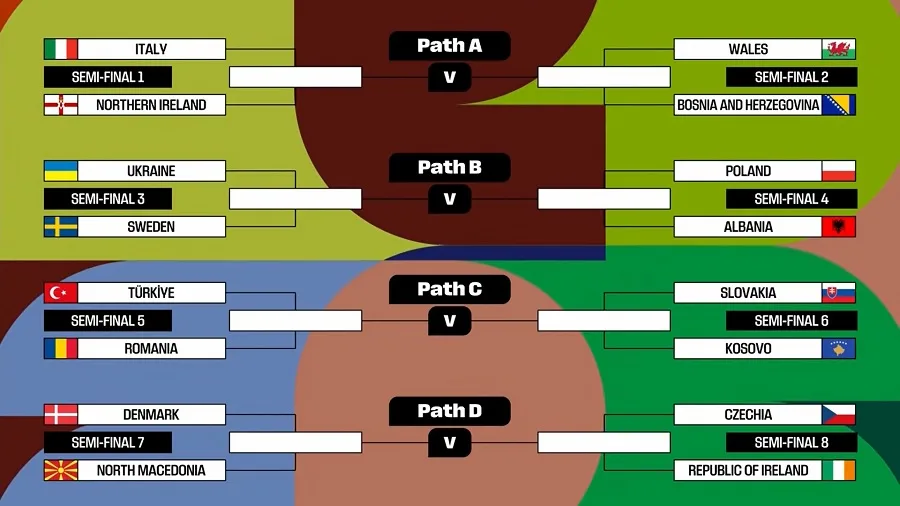 Όσο για την Ιταλία, θα δώσει τον ημιτελικό στην έδρα της απέναντι στη Βόρεια Ιρλανδία, αλλά αν φτάσει στον τελικό, θα χρειαστεί να παίξει εκτός έδρας είτε με την Ουαλία είτε με τη Βοσνία.