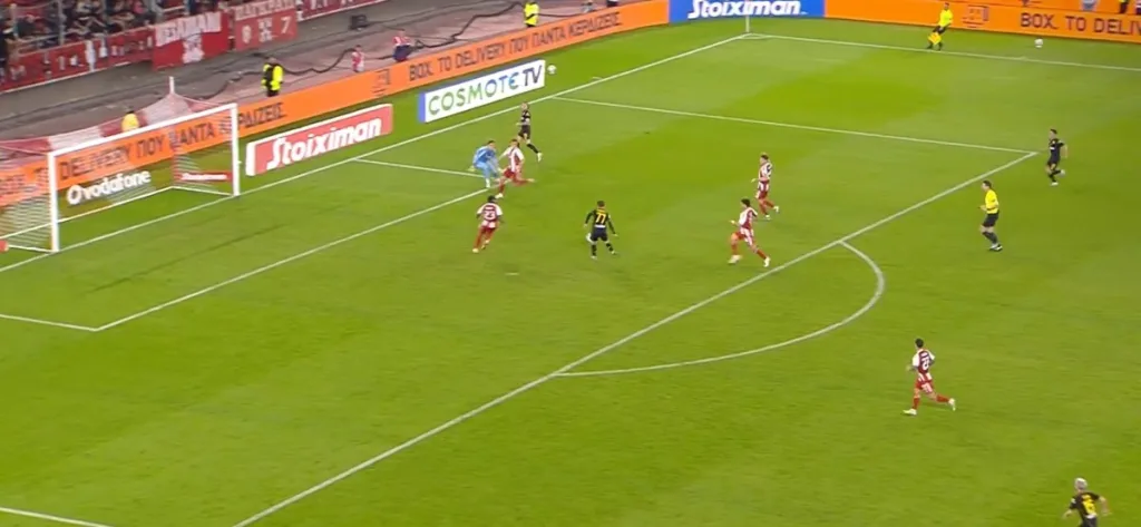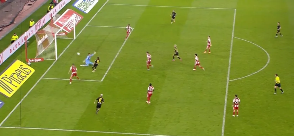 Στο 84ο λεπτό και με το σκορ στο 2-1 ήρθε η σειρά του τερματοφύλακα του Ολυμπιακού. Ο Μιγκέλ Αλφαρέλα πήρε τις κόντρες και πλάσαρε από κοντά, ώστε να κάνει το 2-2!