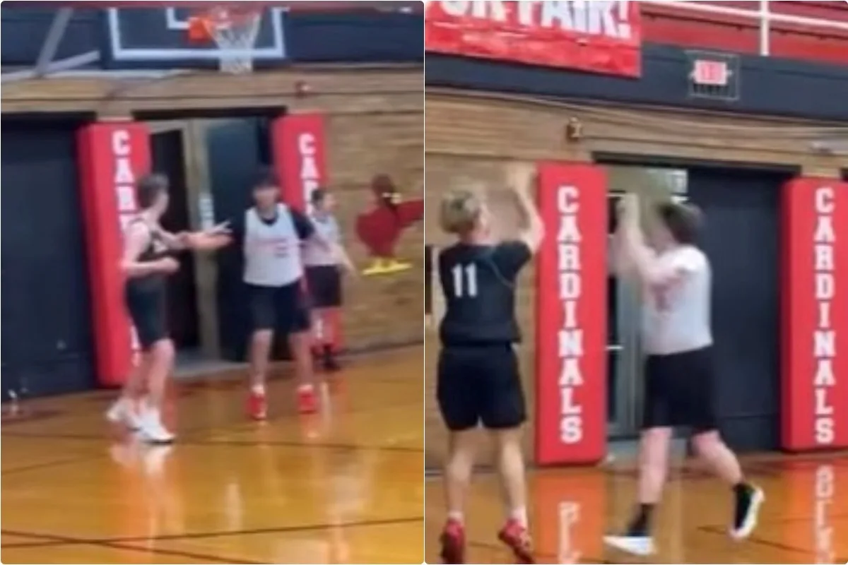 Ο εν λόγω πιτσιρικάς, όπως έχει κυκλοφορήσει ένα βίντεο στα social media που έχει γίνει viral, πέρα πίσω από την πόρτα του γυμναστηρίου, βγήκε από την άλλη πλευρά και ευστόχησε στο μακρινό σουτ που επιχείρησε ενώ η αντίπαλη άμυνα – όπως ήταν λογικό – ψαχνόταν.